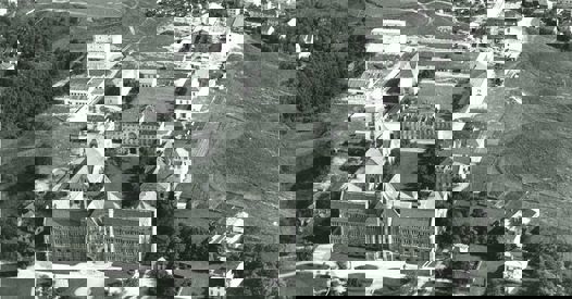 [Illustrasjonsbilde: Flyfoto av Norges Tekniske Høyskole (NTH) på Gløshaugen, 1950-tallet. Hentet fra NTNU UB/Schrøder].