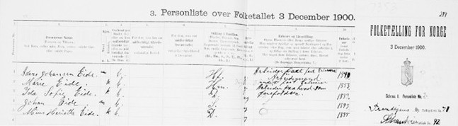 Illustrasjon: Utsnitt av Folketelling for Norge 1900, Digitalarkivet.